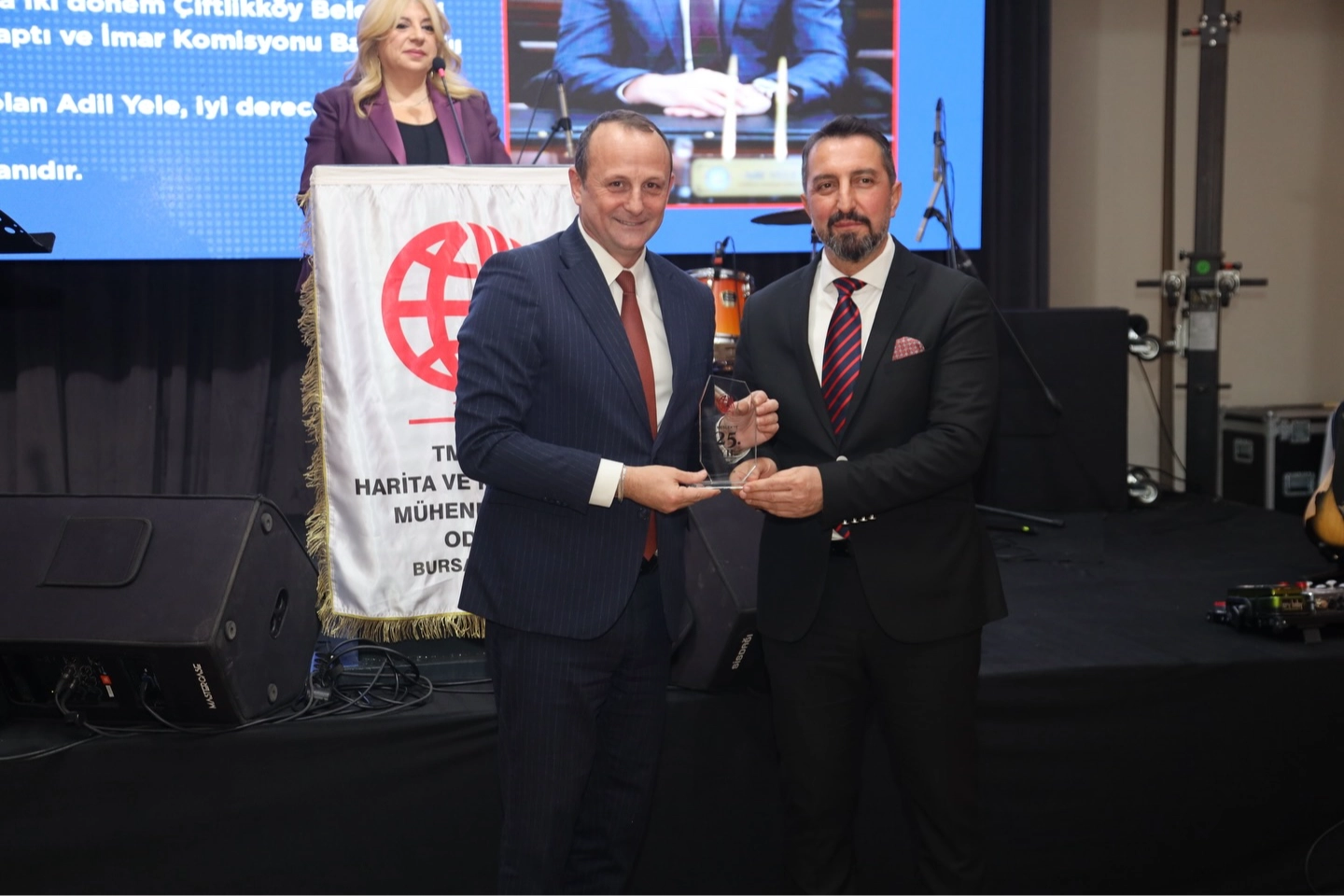 Bursa’da gerçekleştirilen gecede, harita ve kadastro mühendisliği mesleğine uzun yıllar emek veren isimler aynı sofrada buluştu. Mesleğe adım attığı günden bu yana 25 yılı geride bırakan Çiftlikköy Belediye Başkanı Adil Yele’ye, mesleki birikimi ve katkıları dolayısıyla hatıra plaketi takdim edildi.