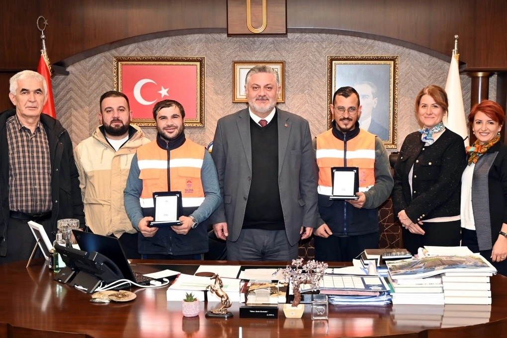 Yalova Belediye Başkanı Mehmet Gürel, kent genelinde gece boyunca yürütülen temizlik çalışmalarında gösterdikleri örnek performans nedeniyle Temizlik İşleri Müdürlüğü personeli Burak Özgeriş ve Hasan Koç’u başarı plaketiyle ödüllendirdi. Belediye hizmet binasında gerçekleştirilen takdimde, gece mesaisinde yürütülen çalışmaların kentin temizliği açısından büyük önem taşıdığı vurgulandı.