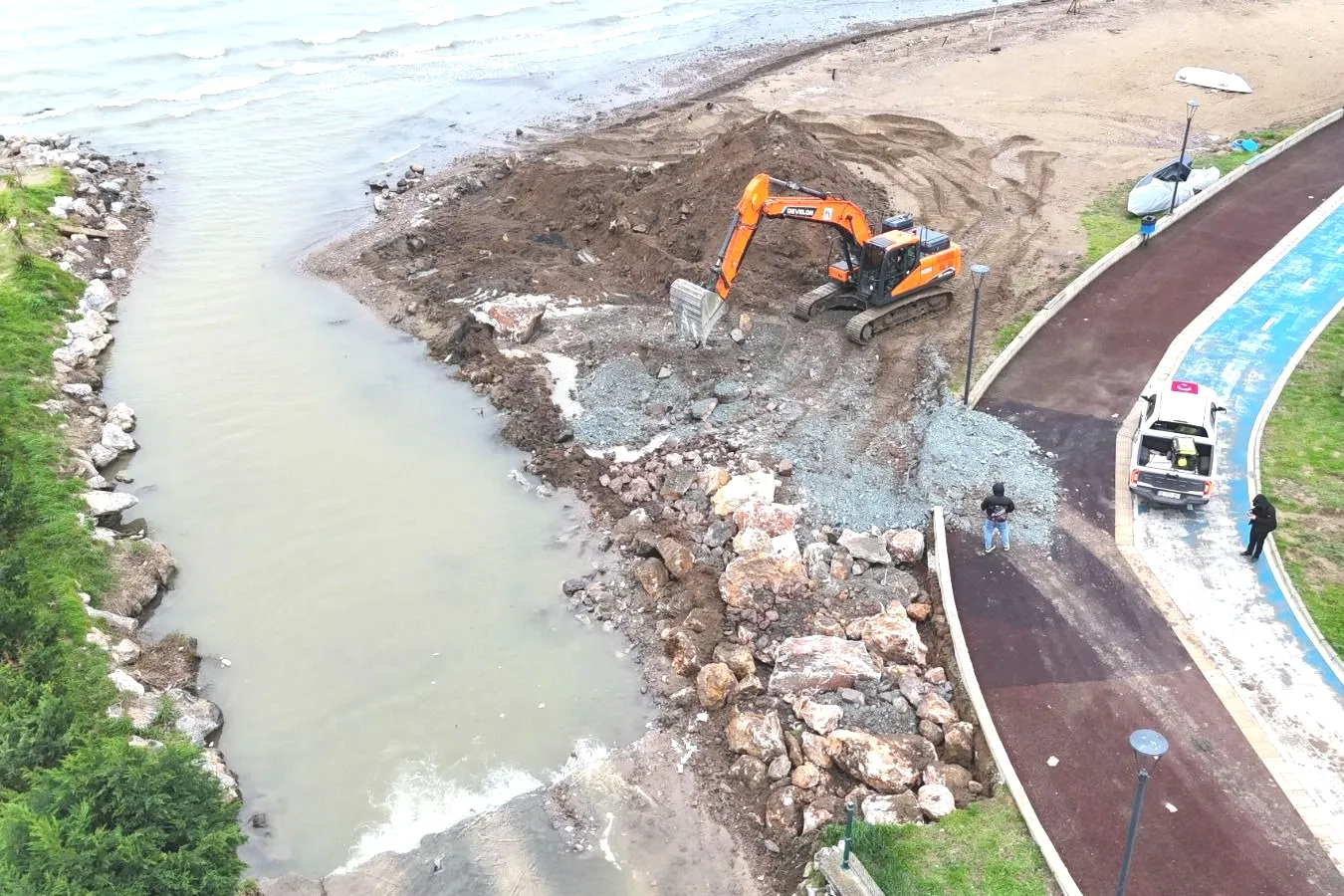 Çiftlikköy Belediyesi Fen İşleri Müdürü Erdinç Yıldız, son dönemde etkili olan yağışlar ve fırtınaların dere çıkış ağzında ciddi aşınmaya yol açtığını belirterek, “Yoğun yağışlar ve fırtına nedeniyle dere yatağında ve çıkış noktasında oyulmalar oluştu. Bu durum çevredeki zeminin dengesini bozdu, kumsalda tahribata yol açtı ve taşkın riskini artırdı. Hem can ve mal güvenliğini sağlamak hem de çevredeki yol, altyapı ve yerleşim alanlarını korumak amacıyla hızlı bir şekilde tahkimat çalışmasına başladık” dedi.