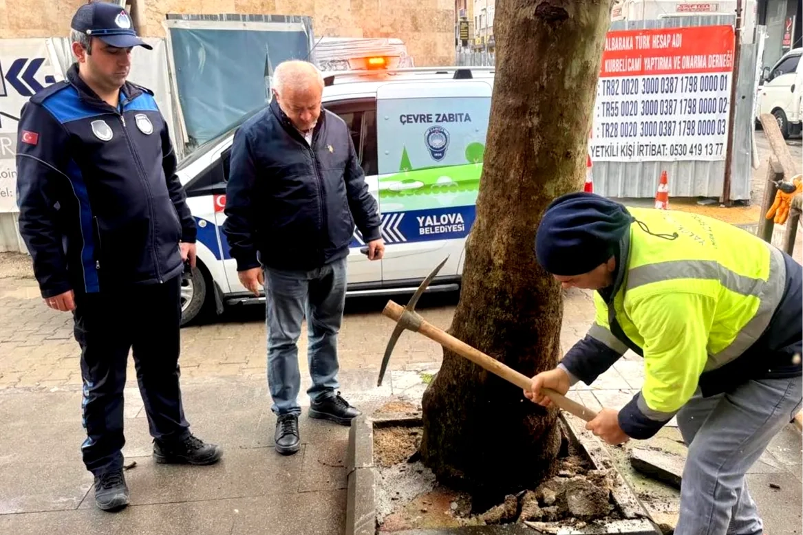 Yalova Belediyesi’nin rutin denetimleri sırasında fark edilen beton dökme işleminin ardından, olayın yaşandığı noktaya yönlendirilen ekipler, çınar ağacının çevresinde yapılan müdahaleyi kaldırarak alanı yeniden toprakla buluşturdu. Çalışma kapsamında ağaç çevresinde yapılan düzenlemenin, ağacın köklerinin zarar görmemesi için dikkatle yürütüldüğü ifade edildi.