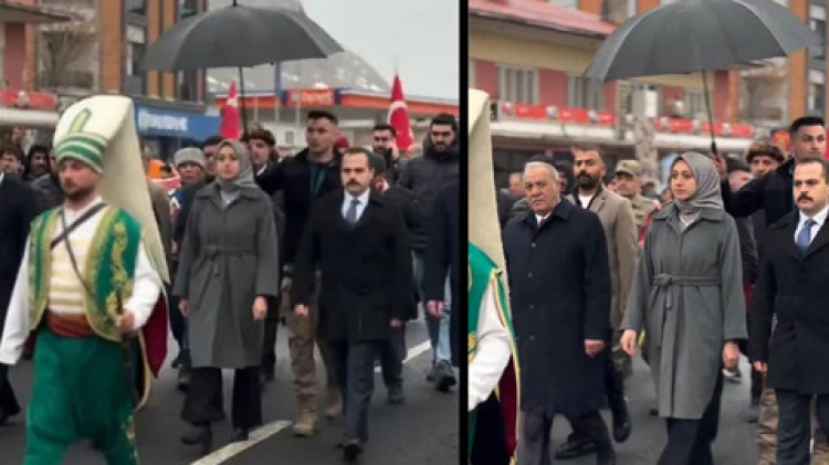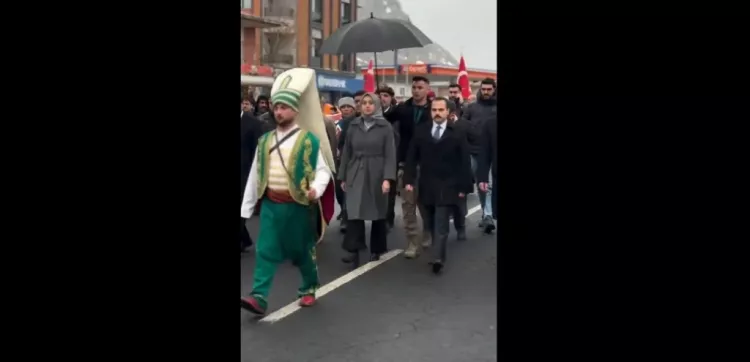 Paylaşılan videoda, kaymakamın bir kortej yürüyüşüne benzer şekilde ilerlediği, ön tarafta Osmanlı dönemi kıyafeti giyen bir kişinin bulunduğu ve kaymakamın arkasından yürüdüğü görülüyor. Aynı görüntülerde, kaymakamın hemen yanında ilerleyen koruma polisinin ise elinde bir şemsiye taşıdığı dikkat çekiyor.