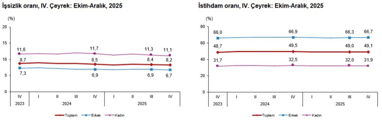 2025 yılının Ekim-Aralık dönemini kapsayan IV. çeyreğinde işsizlik oranı düşüş gösterdi. Hanehalkı İşgücü Araştırması sonuçlarına göre mevsim etkisinden arındırılmış işsizlik oranı bir önceki çeyreğe kıyasla 0,2 puan azalarak %8,2 seviyesine indi.