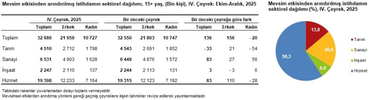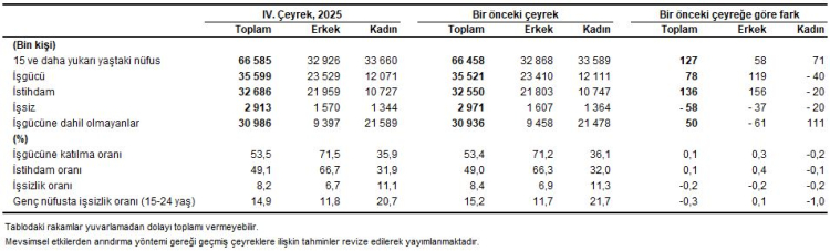 İşgücüne katılma oranı da artış gösterdi. 2025’in son çeyreğinde işgücü 78 bin kişi artarak 35 milyon 599 bine ulaştı. İşgücüne katılma oranı 0,1 puanlık artışla %53,5 oldu.