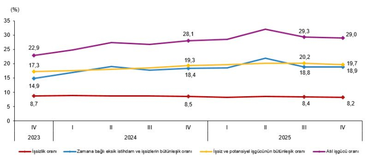 İşsizler, zamana bağlı eksik istihdam ve potansiyel işgücünü kapsayan atıl işgücü oranı 0,3 puanlık azalışla %29,0 oldu.