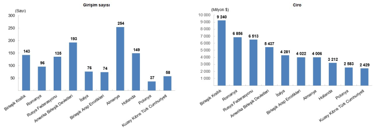 Almanya: 254 girişim ile en fazla şirket 4 milyar 6 milyon dolar ciro Birleşik Krallık: 143 girişim 9 milyar 240 milyon dolar ile en yüksek ciro Romanya: 96 girişim 6 milyar 856 milyon dolar ciro Rusya Federasyonu: 135 girişim 6 milyar 513 milyon dolar ciro