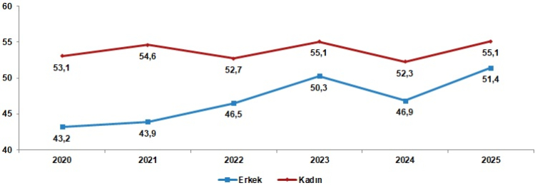 2025 yılında mutlu olduğunu belirten erkeklerin oranı yüzde 51,4 olurken, kadınlarda bu oran yüzde 55,1’e ulaştı. Bir önceki yıla göre hem erkeklerde hem kadınlarda artış kaydedildi. Ancak kadınların mutluluk düzeyi erkeklerin üzerinde seyretmeye devam etti.