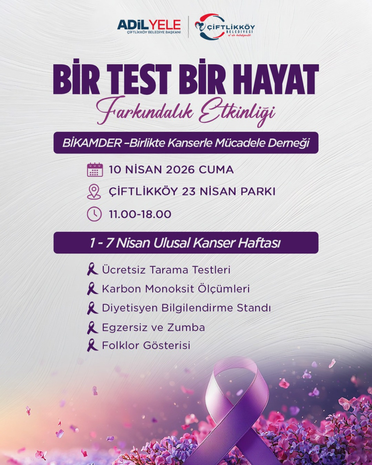 Çiftlikköy’de Ulusal Kanser Haftası kapsamında 10 Nisan Cuma günü düzenlenecek “Bir Test Bir Hayat” etkinliğinde ücretsiz taramalar, sağlık bilgilendirmeleri ve farkındalık çalışmaları yapılacak.