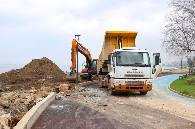 Çiftlikköy Belediyesi Fen İşleri Müdürü Erdinç Yıldız, son dönemde etkili olan yağışlar ve fırtınaların dere çıkış ağzında ciddi aşınmaya yol açtığını belirterek, “Yoğun yağışlar ve fırtına nedeniyle dere yatağında ve çıkış noktasında oyulmalar oluştu. Bu durum çevredeki zeminin dengesini bozdu, kumsalda tahribata yol açtı ve taşkın riskini artırdı. Hem can ve mal güvenliğini sağlamak hem de çevredeki yol, altyapı ve yerleşim alanlarını korumak amacıyla hızlı bir şekilde tahkimat çalışmasına başladık” dedi.