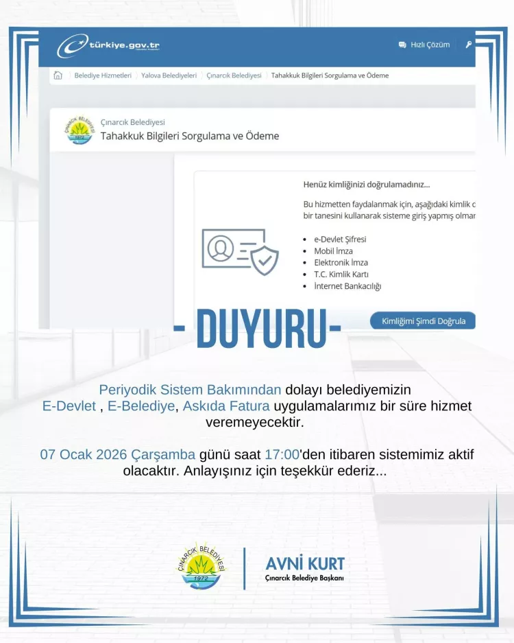 Çınarcık Belediyesi, vatandaşlara daha güvenli ve hızlı dijital hizmet sunabilmek amacıyla önemli bir adım atıyor. Belediye, 7 Ocak 2026 Çarşamba günü, dijital altyapıda kapsamlı bir bakım çalışması gerçekleştirecek.