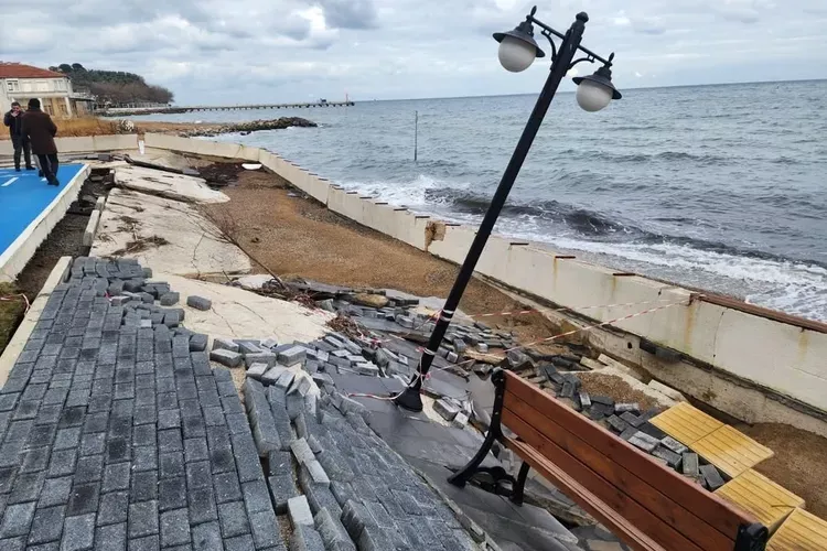 Yalova’da 8 Ocak Perşembe günü etkili olan şiddetli fırtınanın izleri, Çınarcık’a bağlı Kocadere Köyü sahilinde hâlâ net şekilde görülüyor. Fırtına sırasında çöken sahil yürüyüş yolu, bölge sakinlerinin günlük kullanımına kapandı ve kıyı hattında güvenlik endişelerini de beraberinde getirdi.