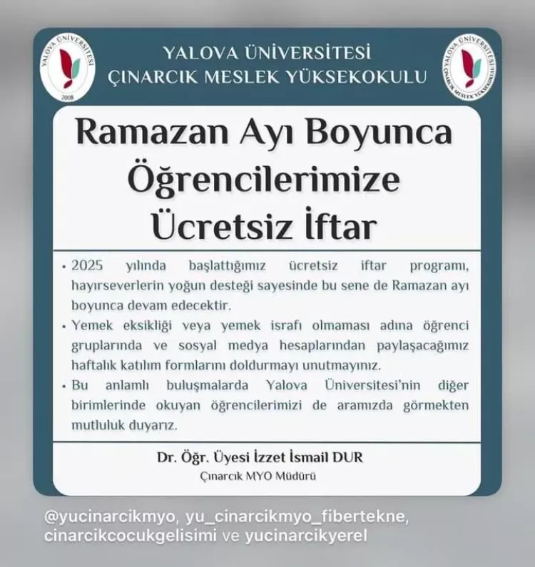 Programın yalnızca Çınarcık MYO öğrencileriyle sınırlı kalmayacağı, Yalova Üniversitesi’nin diğer birimlerinde eğitim gören öğrencilerin de iftar buluşmalarına katılabileceği bildirildi. Bu kapsamda, Ramazan ayı boyunca düzenlenecek iftar sofralarının öğrenciler arasında birlik ve dayanışma ortamını güçlendirmesi bekleniyor.