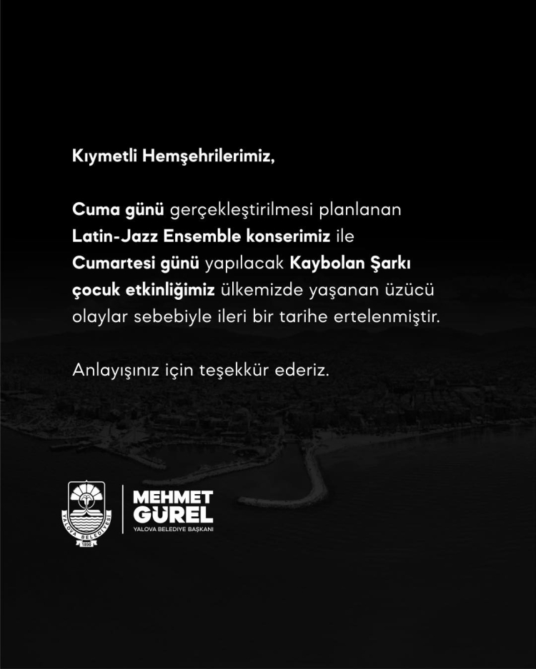 Yalova Belediye Başkanı Mehmet Gürel, Cuma günü gerçekleştirilmesi planlanan Latin-Jazz Ensemble konseri ile Cumartesi günü yapılacak “Kaybolan Şarkı” çocuk etkinliğinin, ülkede yaşanan üzücü gelişmeler nedeniyle ileri bir tarihe ertelendiğini açıkladı.