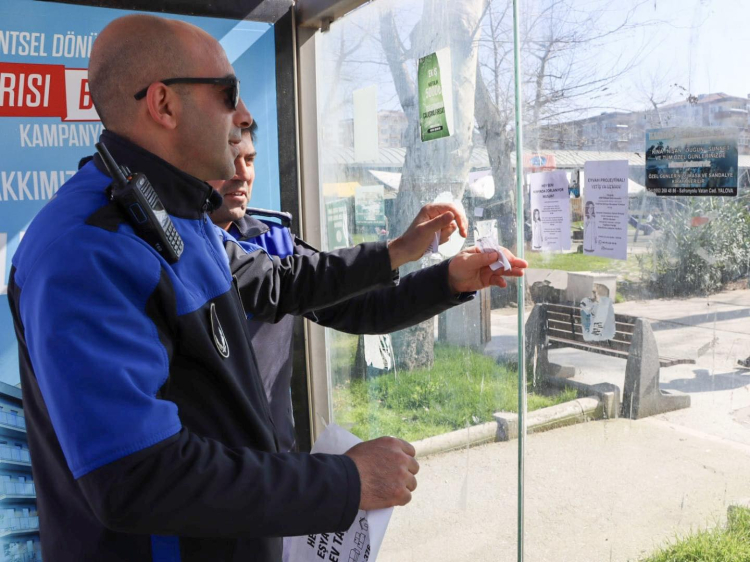 Yalova Belediyesi, otobüs duraklarına izinsiz yapıştırılan reklam ve afişleri zabıta ekipleriyle kaldırıyor. İzinsiz afiş asanlara cezai işlem uygulanacağı bildirildi.