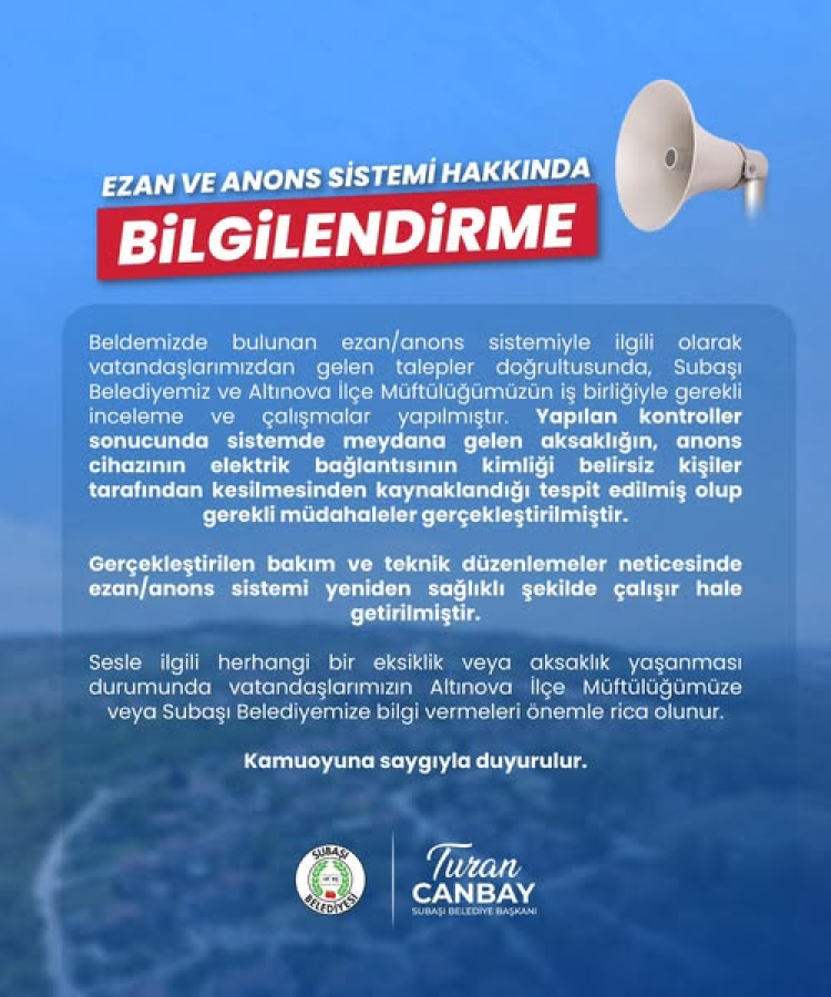 Subaşı Belediyesi tarafından yapılan açıklamada, “Gerçekleştirilen teknik müdahale ve bakım çalışmaları ile ezan anons sistemimiz yeniden sağlıklı şekilde çalışır hale getirilmiştir. Vatandaşlarımız herhangi bir sorun yaşadıklarında Altınova İlçe Müftülüğü veya Subaşı Belediyemize başvurabilir” denildi.