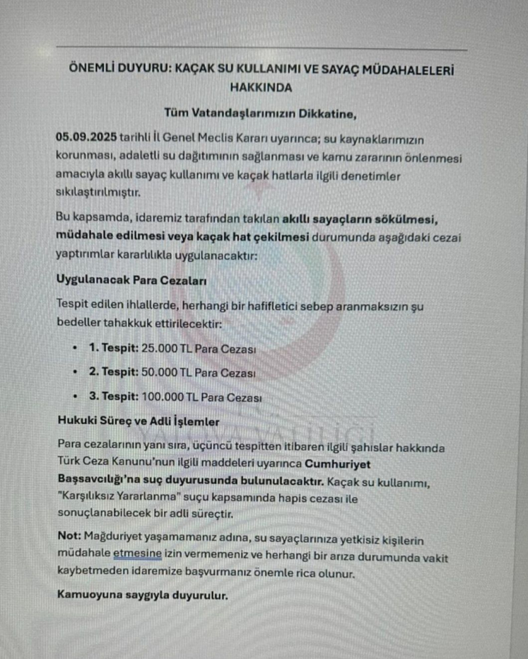 Valiliğin uyarısında yalnızca para cezası değil, hukuki süreç detayı da yer aldı. Buna göre, üçüncü tespitten itibaren ilgili kişiler hakkında Cumhuriyet Başsavcılığı’na suç duyurusunda bulunulacağı bildirildi.Su kaynaklarının korunması hem de şehir genelinde adil kullanımın sağlanması için vatandaşların sayaçlara müdahale etmemesi ve kaçak kullanım gibi uygulamalardan uzak durması gerekmektedir.