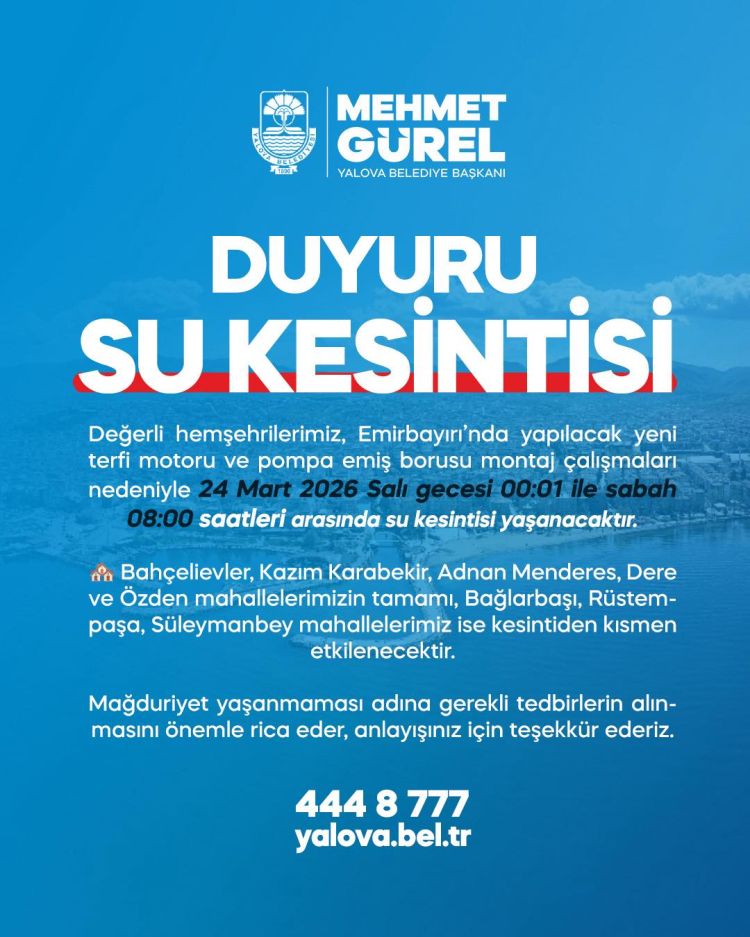 Yalova Belediyesi, vatandaşları 24 Mart 2026 Salı gecesi planlanan su kesintisi hakkında bilgilendirdi. Belediye Başkanı Mehmet Gürel imzasıyla yapılan açıklamada, Emirbayırı bölgesinde gerçekleştirilecek yeni terfi motoru ve pompa emiş borusu montaj çalışmaları nedeniyle kesinti yaşanacak.