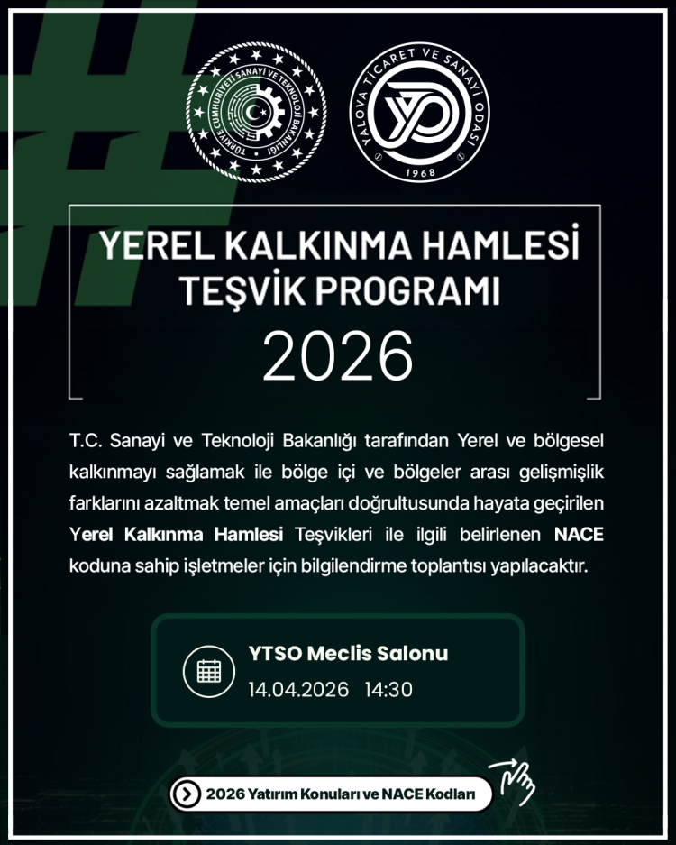 Yalova Ticaret ve Sanayi Odası (YTSO) Meclis Salonu’nda yapılacak toplantıda teşvik programının kapsamı, başvuru şartları ve destek unsurları hakkında detaylı bilgiler verilecek.