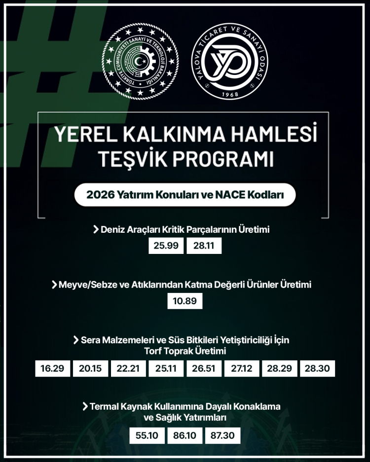 Sanayi ve Teknoloji Bakanlığı’nın Yerel Kalkınma Hamlesi Teşvikleri Yalova’da tanıtılacak. YTSO’da düzenlenecek toplantıda destek programının detayları paylaşılacak.