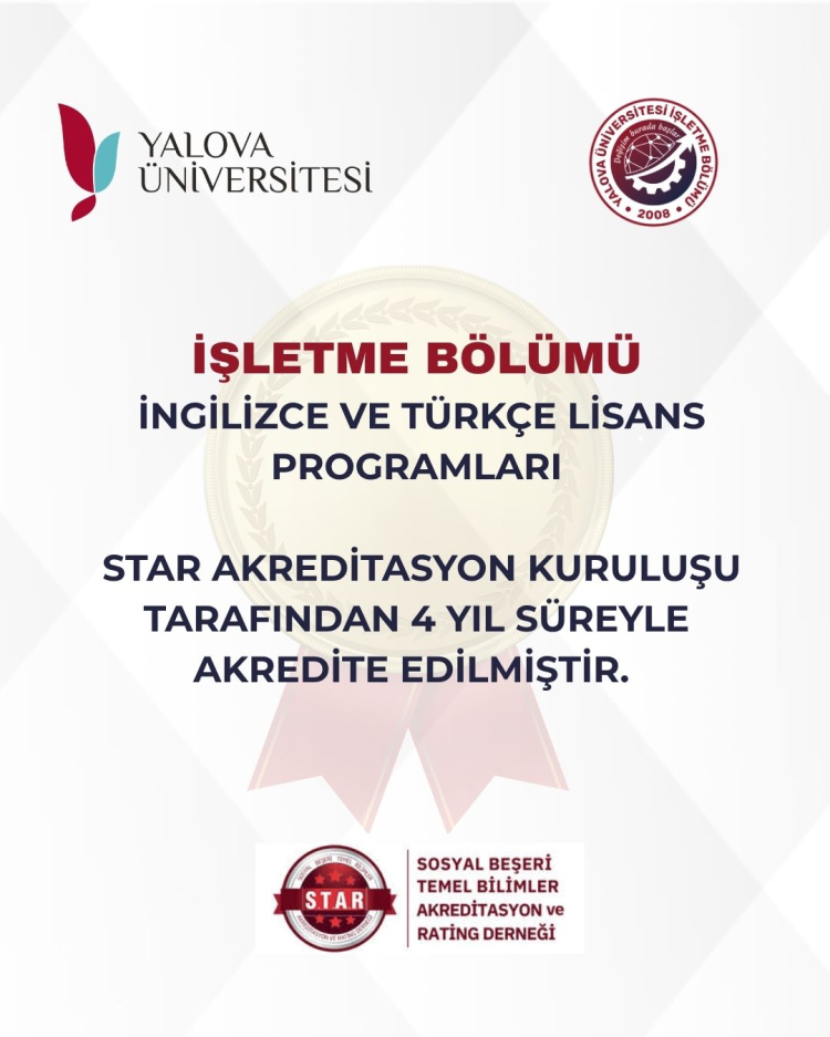 Yalova Üniversitesi İktisadi ve İdari Bilimler Fakültesi bünyesinde faaliyet gösteren İşletme Bölümü önemli bir başarıya imza attı. Sosyal Beşeri ve Temel Bilimler Akreditasyon ve Rating Derneği (STAR) tarafından yürütülen değerlendirme süreci sonucunda, İşletme (Türkçe) ve İşletme (İngilizce) lisans programları 11 Mart 2026 – 11 Mart 2030 tarihleri arasında geçerli olmak üzere 4 yıl süreyle akredite edildi.