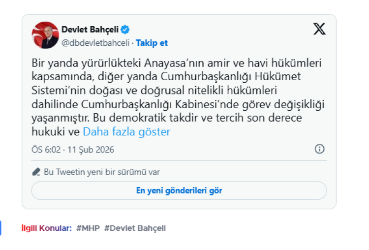 MHP Genel Başkanı Devlet Bahçeli, yaşanan gelişmelerin ardından sosyal medya hesabından bir açıklama yayımladı. Bahçeli, kabinedeki görev değişikliğini “hukuki ve meşru bir çizgide” değerlendirdiğini belirterek, görevinden ayrılan bakanlara teşekkür etti ve yeni atanan bakanlara başarı diledi.