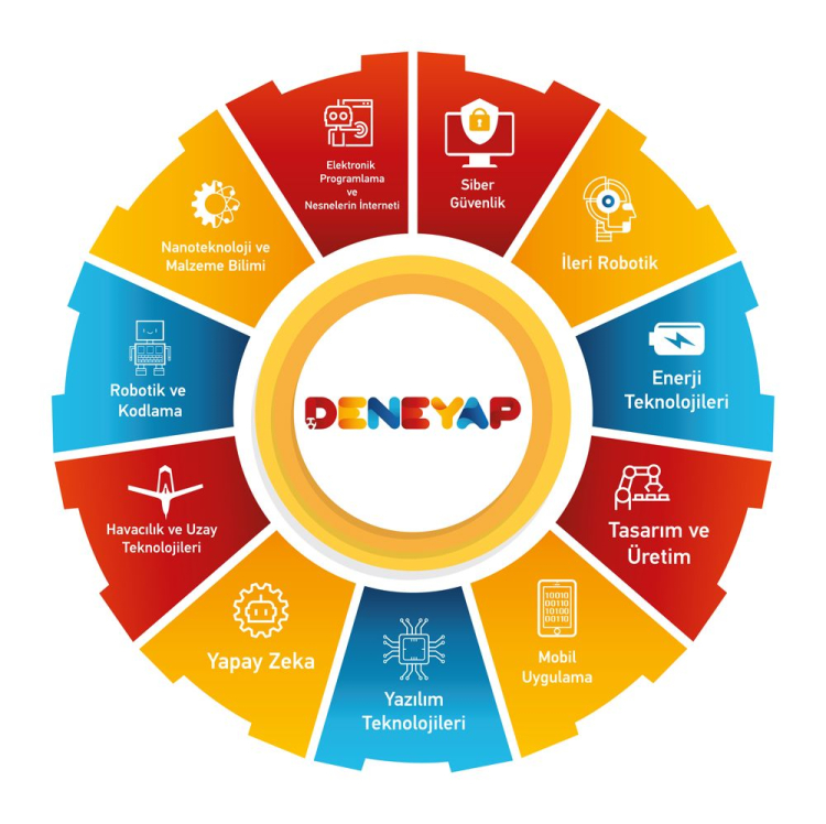 Deneyap Teknoloji Atölyeleri’nde öğrencilere, çağın ihtiyaçlarına uygun ve geleceğin mesleklerine yön veren alanlarda eğitimler sunulacak. Program kapsamında; yapay zeka, havacılık ve uzay teknolojileri, robotik ve kodlama, nanoteknoloji ve malzeme bilimi, yazılım teknolojileri, siber güvenlik, ileri robotik, enerji teknolojileri, tasarım ve üretim, mobil uygulama geliştirme, elektronik programlama ve nesnelerin interneti gibi birçok başlıkta uygulamalı eğitimler verilecek.