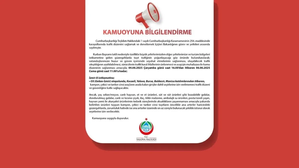 Yalova Valiliği, Kurban Bayramı tatili öncesinde artacak trafik yoğunluğunu göz önünde bulundurarak İçişleri Bakanlığı'nın talimatları doğrultusunda trafik düzeni ve güvenliği adına önemli bir açıklama yaptı.